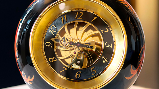 Like the legendary bird rising anew from its ashes, this timepiece embodies eternal beauty, harmony and time’s regenerative nature. The phrase “eternal fire” captures the myth’s essence: a continuous cycle of death and rebirth, perfectly echoing the ongoing movement of the timepiece’s mechanism. More than a clock, The Phoenix Eternis Ignis is a poetic fusion of myth and mechanical – where legend and craftsmanship ignite in a celebration of eternal time. Against a deep black background, the Phoenix emerges in vibrant shades of orange, hand-painted by artist Morena Fetoshi in fine detail as it ascends in a blaze of light.