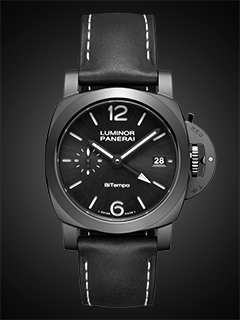 Renowned for its resistance to high temperatures, scratches and corrosion, ceramic has become a staple in the watchmaker’s catalogue. This material now adorns the case of the Luminor which is guaranteed water-resistant to 300 metres. Powered by an automatic movement with an impressive three-day power reserve, this 40mm timepiece features hours, minutes, small seconds, date, GMT and stop-seconds functions. It comes with two straps, one in black calfskin leather and the other in rubber.
