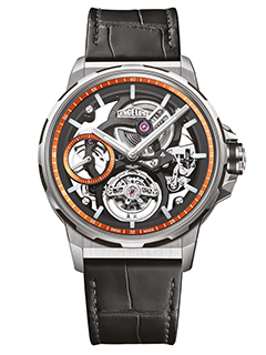 With orange as a common thread and the 3D aesthetic of its skeletonised calibre, this timepiece plays on contrasts, distinguishing itself by its black PVD-treated mainplate and bridges, its iconic wheels and its flying tourbillon. The movement is housed in a 42.5mm carbon composite case, encased in a titanium cage. Produced in a 25-piece limited edition, this timepiece comes with three interchangeable straps in black alligator leather, orange rubber or satin-finished titanium.