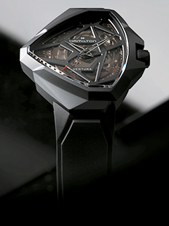 A symbol of avant-garde watchmaking when released in 1957, this watch continues to evolve, now featuring a reworked design with a sculptural black PVD-coated, angular case. Endowed with an 80-hour power reserve, the mechanism of the skeletonised automatic calibre driving it is gradually revealed through the gradient-toned mineral crystal that transitions from opaque black to a transparent fumé shade. The hands are coated with Super-LumiNova for enhanced legibility.