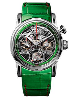 Resulting from five years of development and produced in a 150-piece limited edition, this timepiece features a flying tourbillon combined with an ultra-thin automatic flyback chronograph, incorporating an instant-jump minutes counter. Endowed with a more ergonomic and accurate zero-reset system, Calibre 8100 is housed within a 39mm case combining – like the bracelet – the lightness of titanium with the robustness of BMG, a precious metal glass that is highly resistant to wear and corrosion.