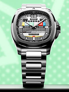 The steel TV-shaped case of this colourful, graphic special edition frames a dial embossed with the colourful bands typical of vintage television sets. The large date is displayed at 12 o’clock, while the recessed hands and hour-markers are coated with white Super-LumiNova. This playful timepiece supplied with three interchangeable straps is powered by an automatic calibre featuring an 80-hour power reserve and exemplary resistance to both magnetism and shocks.