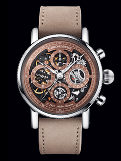 The name of this timepiece is inspired by the colour palette of the Dakar region, with its brown dial radiating warmth and its sand-coloured nubuck strap. It is one of the new models marking the 30th anniversary of the Opus line, demonstrating the company’s skeleton-working mastery. At the heart of a 41mm titanium case sits a dial on which each indication is elegantly displayed: central seconds, 30-minute and 12-hour counters, analogue date and small seconds.