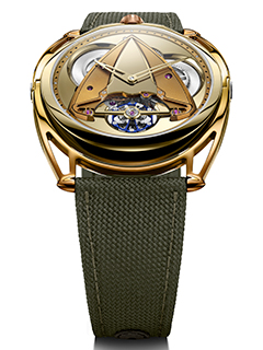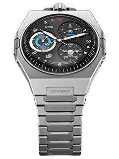 Equipped with neither chronograph nor calendar functions, this model instead features a main dial enhanced with three instruments measuring the distances travelled by our planet. The Earth counter at 2 o’clock measures every 10km travelled by the Earth in its rotation; at 4 o’clock, the Sun subdial records every 1,000km travelled in the solar orbit; while the Orbit counterpart at 9 o’clock combines the two trajectories. A peripheral hand placed on the back of the case tracks the hours on a one-day scale.