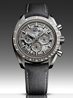 In a nod to the watchmaker’s space exploration heritage, this timepiece features a 44.25mm case in plasma-treated polished and satin-brushed grey ceramic. The bezel bears a laser-engraved tachymeter scale coated with Super-LumiNova. The mainplate and bridges of the Co-Axial Master Chronometer movement are adorned with engravings recalls the lunar surface and the caseback carries the famous quote now associated with the Apollo 8 mission: “The moon is essentially grey”.