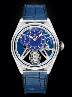 Inspired by the gimbal suspension system used in marine chronometers to counteract the effects of gravity, the Manufacture based in Le Locle has miniaturised the principle with its Zenith Zero G movement. To celebrate its 160th anniversary, it is unveiling two new 10-piece limited series in 46 mm respectively blue or transparent sapphire cases. They house hand-wound El Primero Calibre 8812 and the fascinating Zero Gravity module, which pivots at 6 o’clock to remain in a horizontal position.