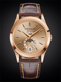 This rose gold creation indicates the day and month at 12 o’clock along with the date at 6 o’clock, while a 24-hour subdial incorporates a moon phase. Its subtly shimmering effect is enhanced by faceted applied hour-markers and Dauphine-type hands. The self-winding movement equipped with a stop-seconds function requires just one manual adjustment per year at the end of February, while the correction push-pieces on the sides of the case enable easy adjustment of the various displays.